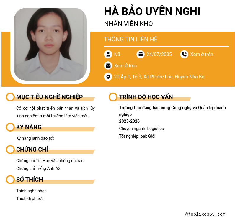 Xem hồ sơ ứng viên Hà Bảo Uyên Nghi cần 2 điểm. Hồ sơ được cập nhật ngày: 03/11/2024