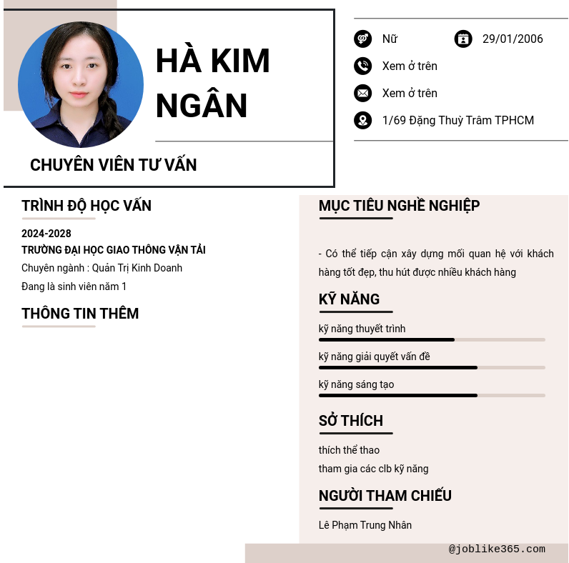 Xem hồ sơ ứng viên Hà Kim Ngân cần 2 điểm. Hồ sơ được cập nhật ngày: 26/09/2024