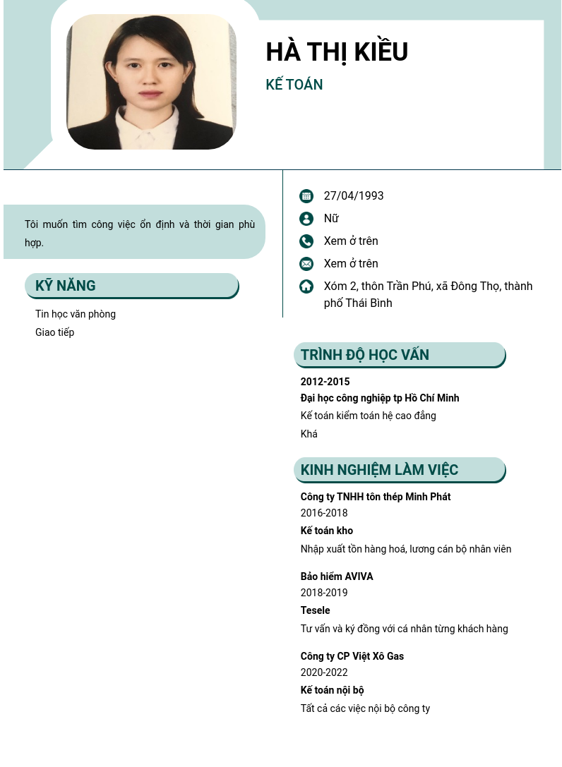 Xem hồ sơ ứng viên HÀ THỊ KIỀU cần 2 điểm. Hồ sơ được cập nhật ngày: 23/05/2024
