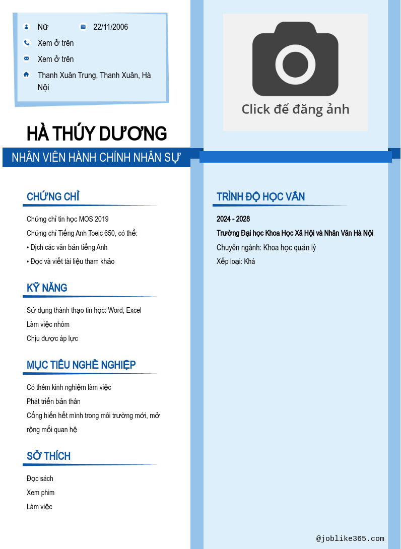 Xem hồ sơ ứng viên Hà Thúy Dương cần 2 điểm. Hồ sơ được cập nhật ngày: 19/09/2024