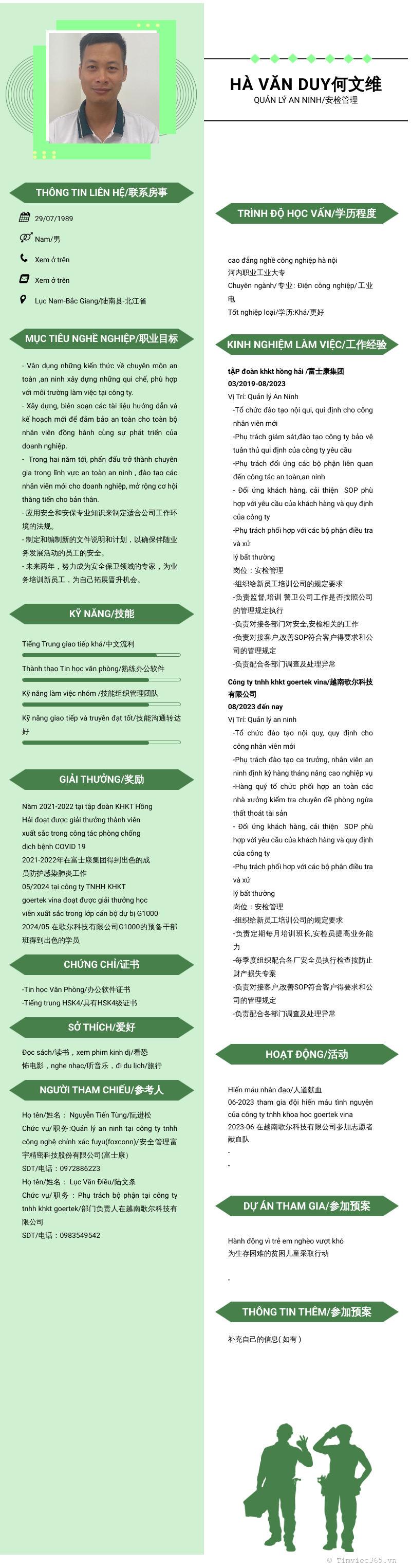 Xem hồ sơ ứng viên HÀ VĂN DUY何文维 cần 2 điểm. Hồ sơ được cập nhật ngày: 25/11/2024