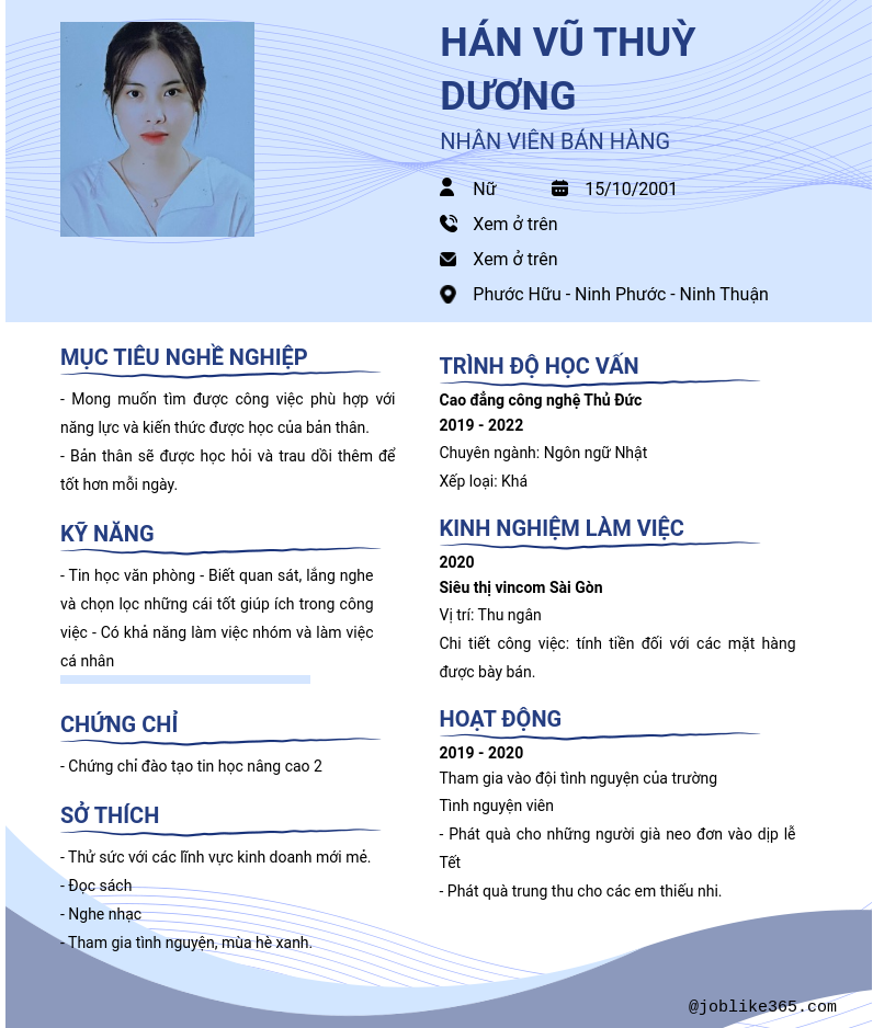 Xem hồ sơ ứng viên Hán Vũ Thuỳ Dương cần 2 điểm. Hồ sơ được cập nhật ngày: 10/12/2024