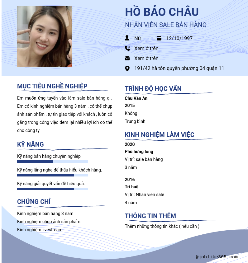 Xem hồ sơ ứng viên Hồ Bảo Châu cần 2 điểm. Hồ sơ được cập nhật ngày: 24/09/2024