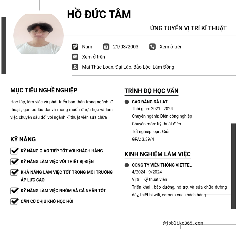 Xem hồ sơ ứng viên HỒ ĐỨC TÂM cần 2 điểm. Hồ sơ được cập nhật ngày: 25/11/2024
