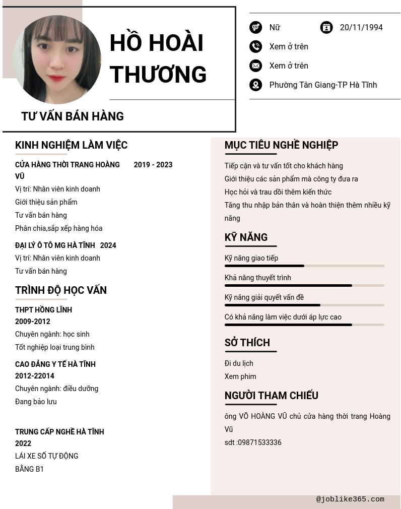 Xem hồ sơ ứng viên HỒ HOÀI THƯƠNG cần 2 điểm. Hồ sơ được cập nhật ngày: 12/12/2024