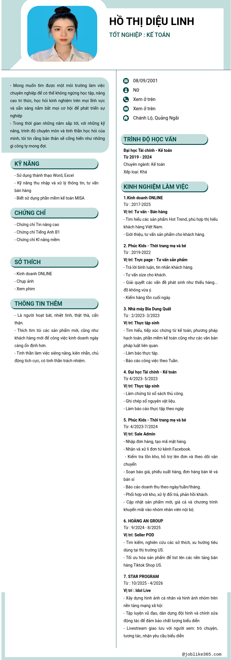 Xem hồ sơ ứng viên HỒ THỊ DIỆU LINH cần 2 điểm. Hồ sơ được cập nhật ngày: 06/04/2026