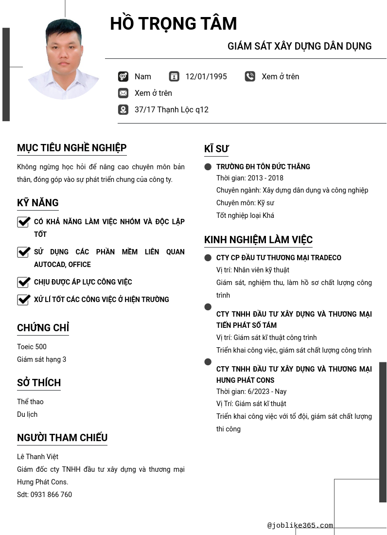 Xem hồ sơ ứng viên Hồ Trọng Tâm cần 2 điểm. Hồ sơ được cập nhật ngày: 06/06/2025