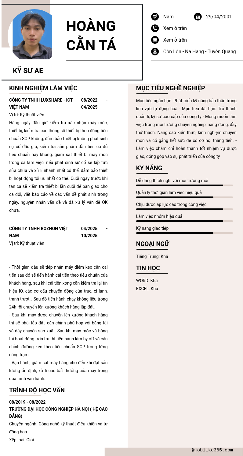 Xem hồ sơ ứng viên HOÀNG CẰN TÁ cần 2 điểm. Hồ sơ được cập nhật ngày: 18/10/2025