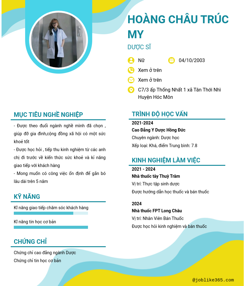 Xem hồ sơ ứng viên Hoàng Châu Trúc My cần 2 điểm. Hồ sơ được cập nhật ngày: 25/10/2024