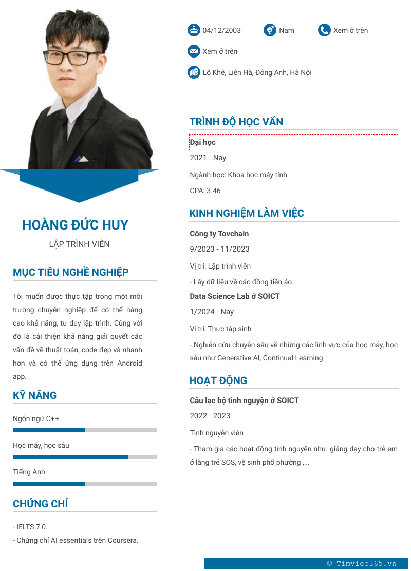 Xem hồ sơ ứng viên Hoàng Đức huy cần 2 điểm. Hồ sơ được cập nhật ngày: 25/07/2024