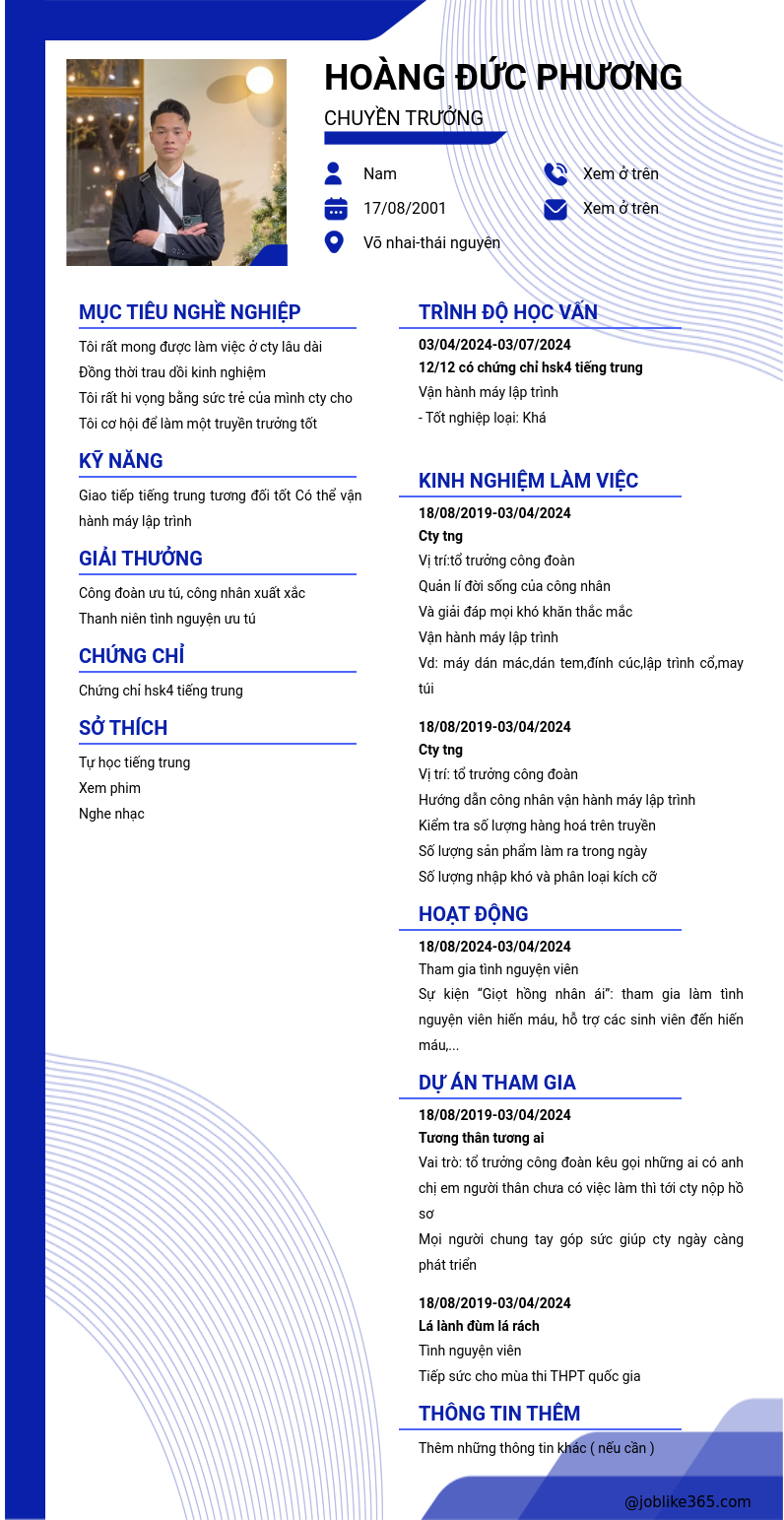 Xem hồ sơ ứng viên Hoàng đức phương cần 2 điểm. Hồ sơ được cập nhật ngày: 07/07/2024