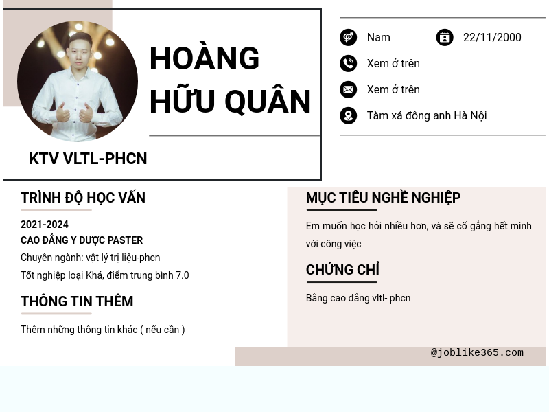 Xem hồ sơ ứng viên Hoàng hữu quân cần 2 điểm. Hồ sơ được cập nhật ngày: 16/09/2024