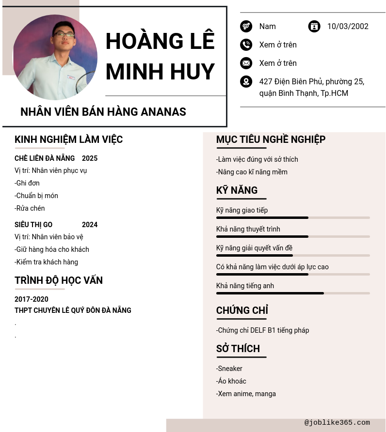 Xem hồ sơ ứng viên Hoàng lê minh huy cần 2 điểm. Hồ sơ được cập nhật ngày: 11/08/2025