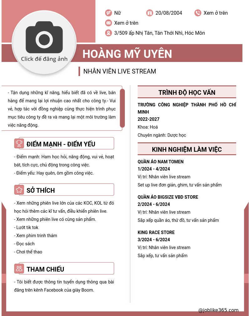 Xem hồ sơ ứng viên HOÀNG MỸ UYÊN cần 2 điểm. Hồ sơ được cập nhật ngày: 05/06/2024