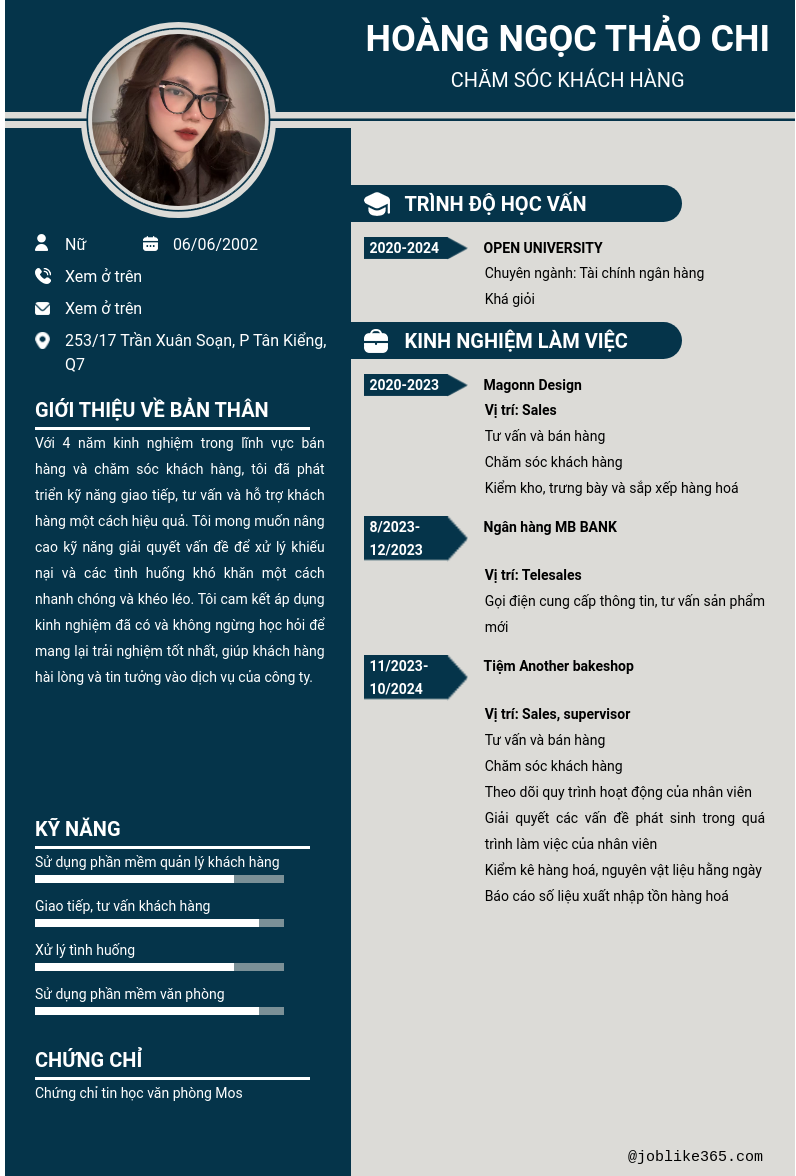 Xem hồ sơ ứng viên HOÀNG NGỌC THẢO CHI cần 2 điểm. Hồ sơ được cập nhật ngày: 31/10/2024