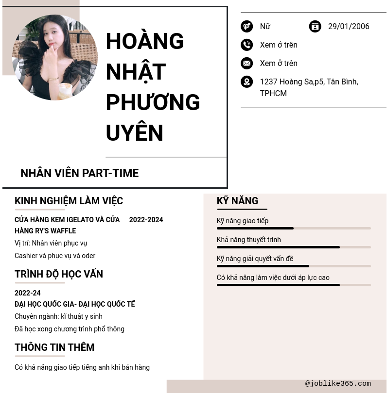 Xem hồ sơ ứng viên Hoàng Nhật Phương Uyên cần 2 điểm. Hồ sơ được cập nhật ngày: 13/10/2024