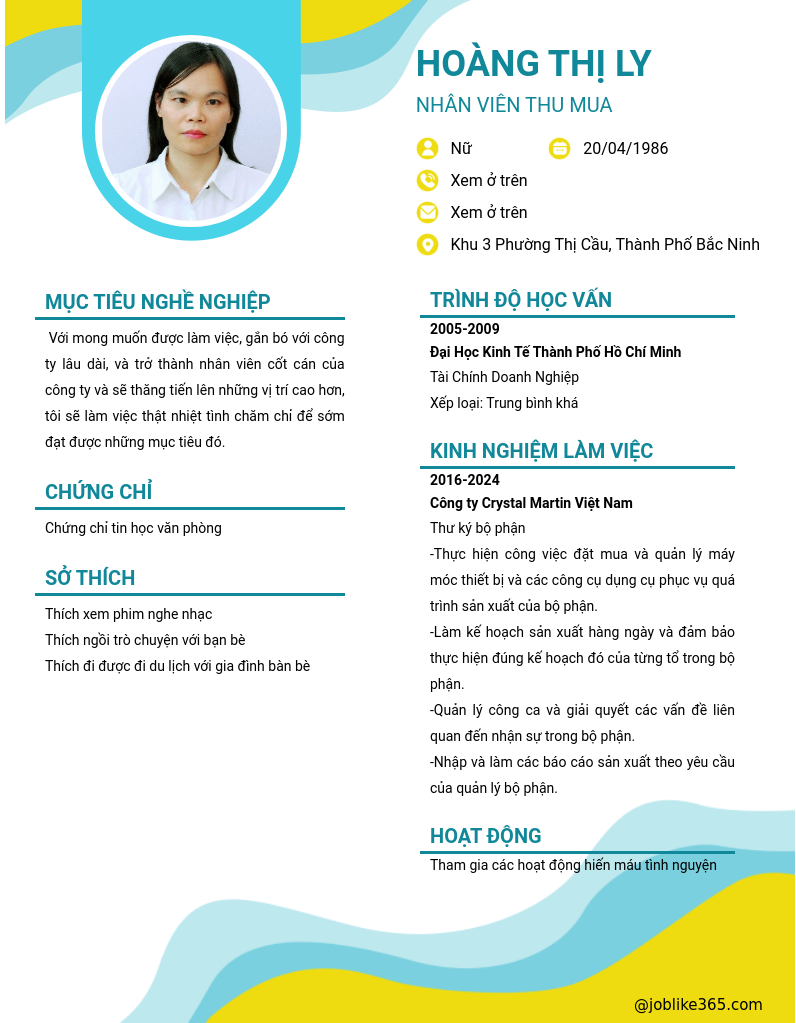 Xem hồ sơ ứng viên HOÀNG THỊ LY cần 2 điểm. Hồ sơ được cập nhật ngày: 29/05/2024