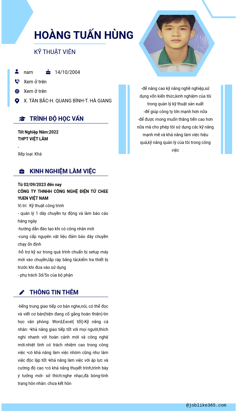 Xem hồ sơ ứng viên Hoàng Tuấn Hùng cần 2 điểm. Hồ sơ được cập nhật ngày: 27/11/2024