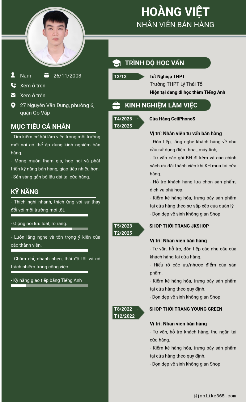 Xem hồ sơ ứng viên Hoàng việt cần 2 điểm. Hồ sơ được cập nhật ngày: 23/09/2025