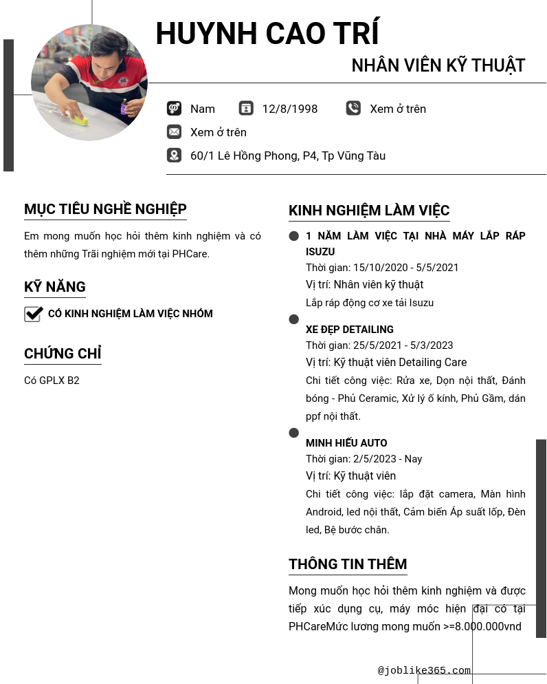 Xem hồ sơ ứng viên Huynh Cao Trí cần 2 điểm. Hồ sơ được cập nhật ngày: 18/08/2024