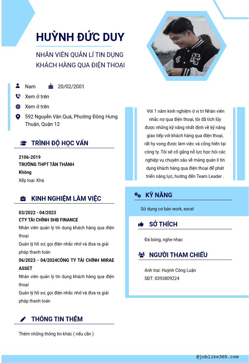 Xem hồ sơ ứng viên HUỲNH ĐỨC DUY cần 2 điểm. Hồ sơ được cập nhật ngày: 02/08/2024