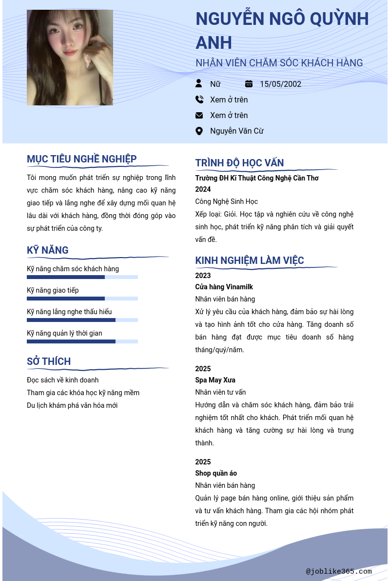 Xem hồ sơ ứng viên NGUYỄN NGÔ QUỲNH ANH cần 2 điểm. Hồ sơ được cập nhật ngày: 26/08/2025