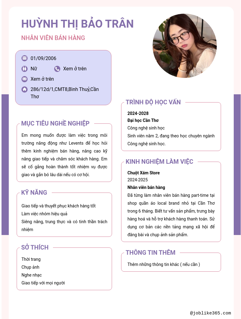 Xem hồ sơ ứng viên Huỳnh Thị Bảo Trân cần 2 điểm. Hồ sơ được cập nhật ngày: 29/10/2025