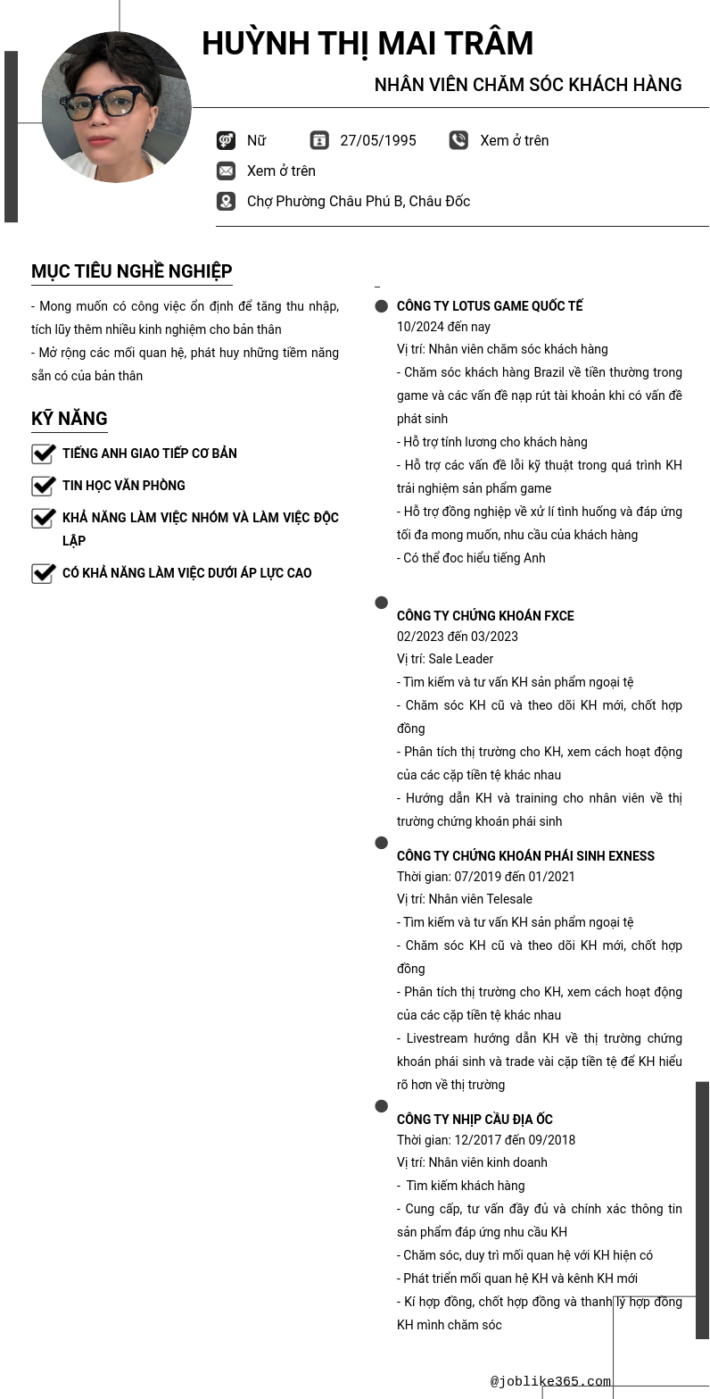 Xem hồ sơ ứng viên HUỲNH THỊ MAI TRÂM cần 2 điểm. Hồ sơ được cập nhật ngày: 09/06/2025