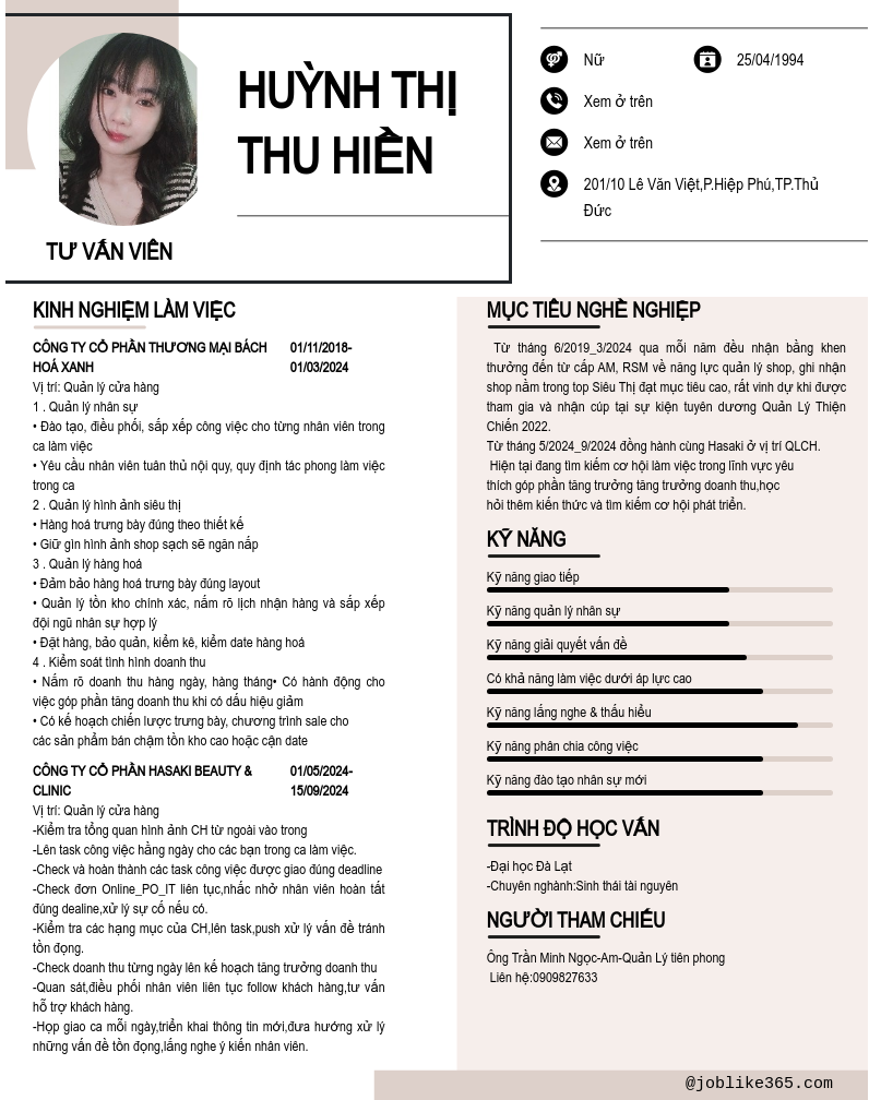 Xem hồ sơ ứng viên huỳnh thị thu hiền cần 2 điểm. Hồ sơ được cập nhật ngày: 22/10/2024