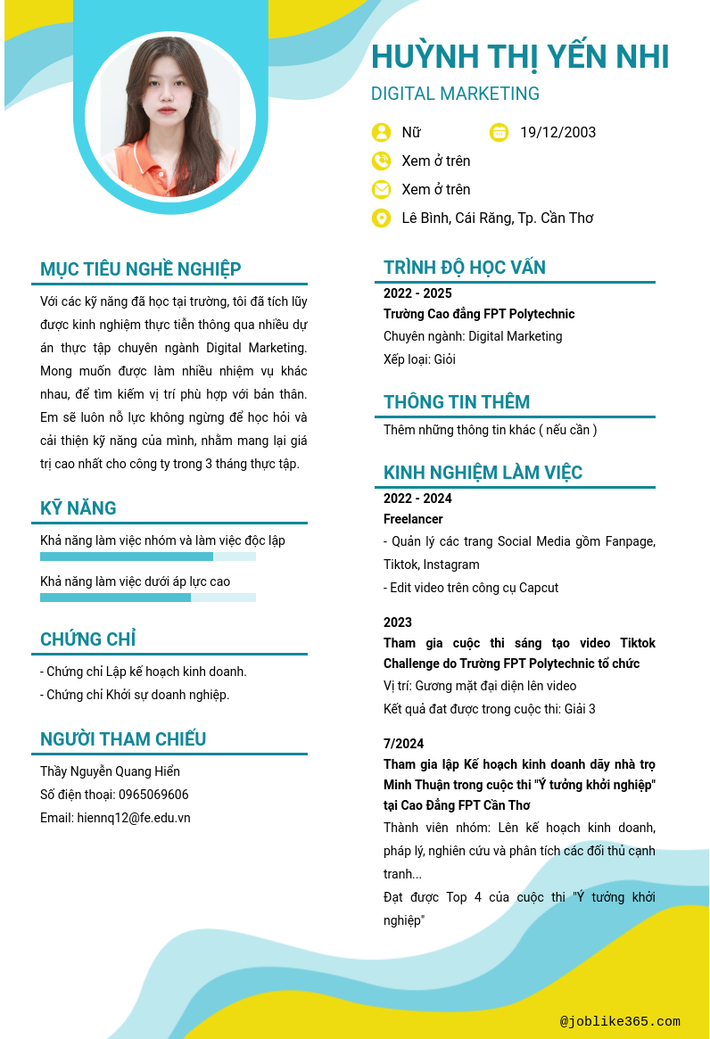 Xem hồ sơ ứng viên Huỳnh Thị Yến Nhi cần 2 điểm. Hồ sơ được cập nhật ngày: 12/08/2024