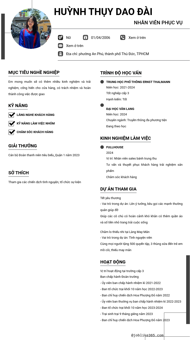 Xem hồ sơ ứng viên Huỳnh Thụy Dao Đài cần 2 điểm. Hồ sơ được cập nhật ngày: 05/08/2024