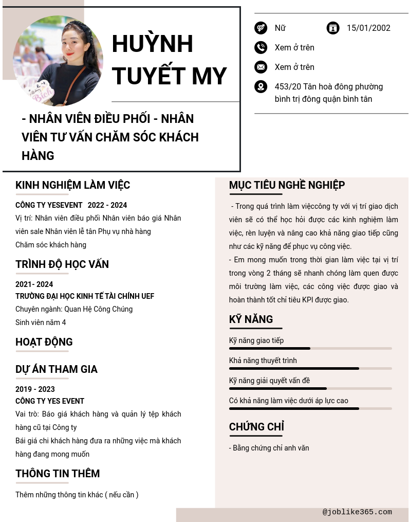 Xem hồ sơ ứng viên Huỳnh Tuyết My cần 2 điểm. Hồ sơ được cập nhật ngày: 12/09/2024