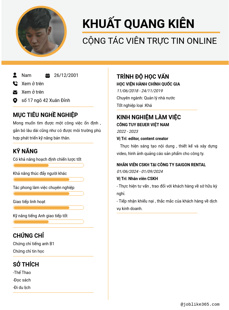 Xem hồ sơ ứng viên khuất quang kiên cần 2 điểm. Hồ sơ được cập nhật ngày: 21/11/2024