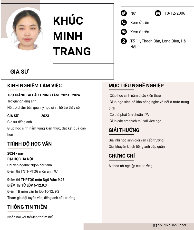 Xem hồ sơ ứng viên Khúc Minh Trang cần 2 điểm. Hồ sơ được cập nhật ngày: 14/11/2024
