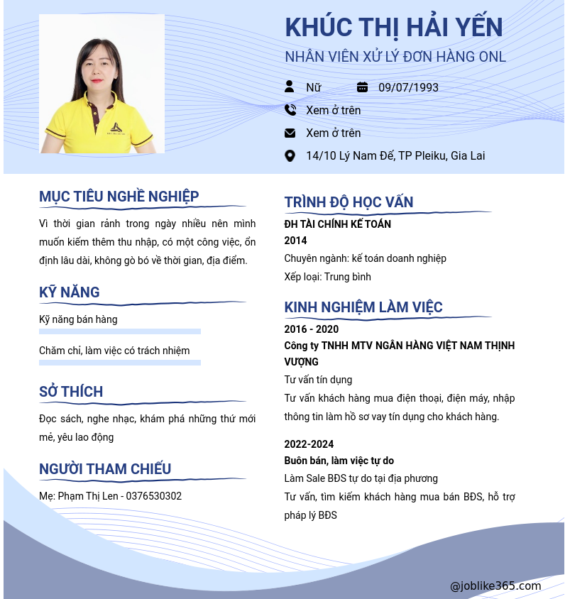 Xem hồ sơ ứng viên KHÚC THỊ HẢI YẾN cần 2 điểm. Hồ sơ được cập nhật ngày: 01/07/2024