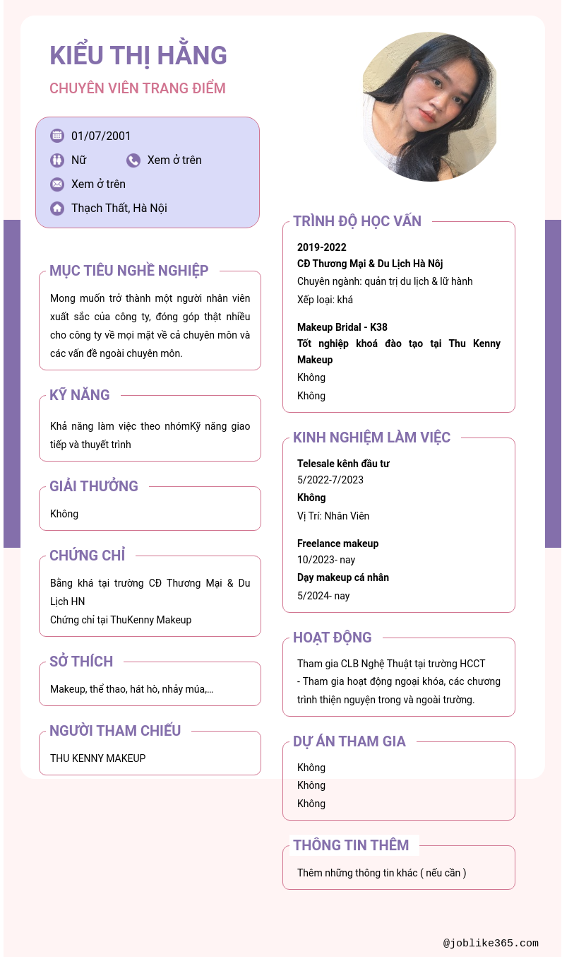 Xem hồ sơ ứng viên KIỂU THỊ HẰNG cần 2 điểm. Hồ sơ được cập nhật ngày: 29/08/2024