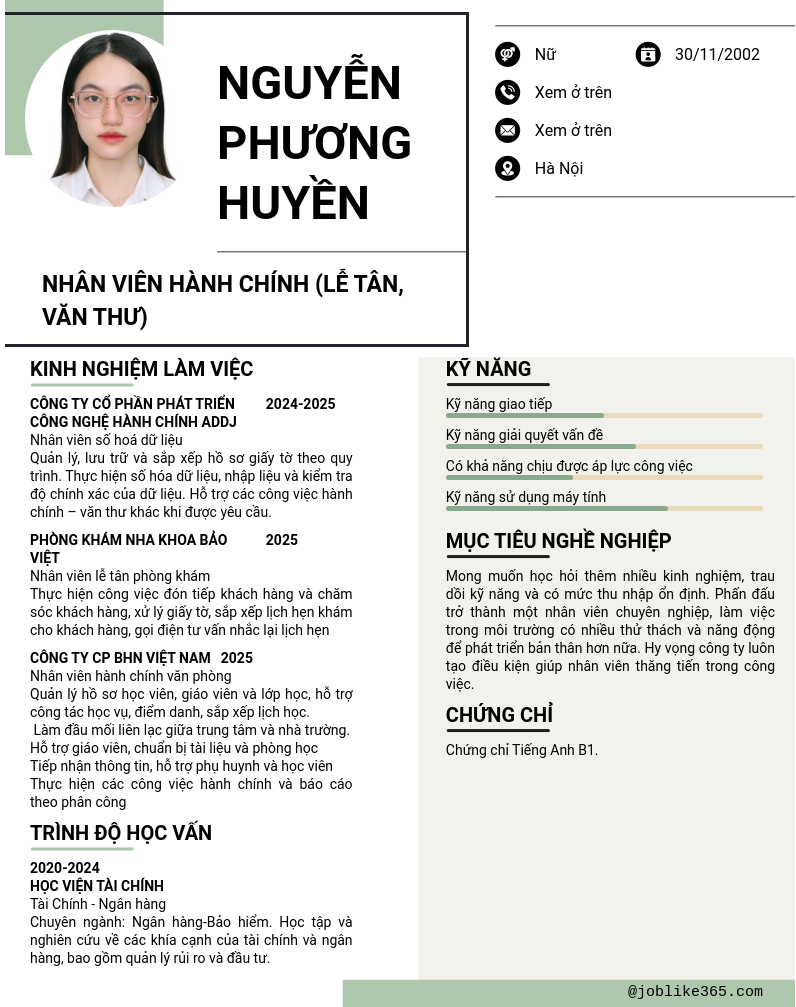 Xem hồ sơ ứng viên Nguyễn Phương Huyền cần 2 điểm. Hồ sơ được cập nhật ngày: 28/02/2026