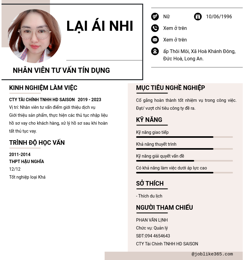 Xem hồ sơ ứng viên LẠI ÁI NHI cần 2 điểm. Hồ sơ được cập nhật ngày: 02/10/2024