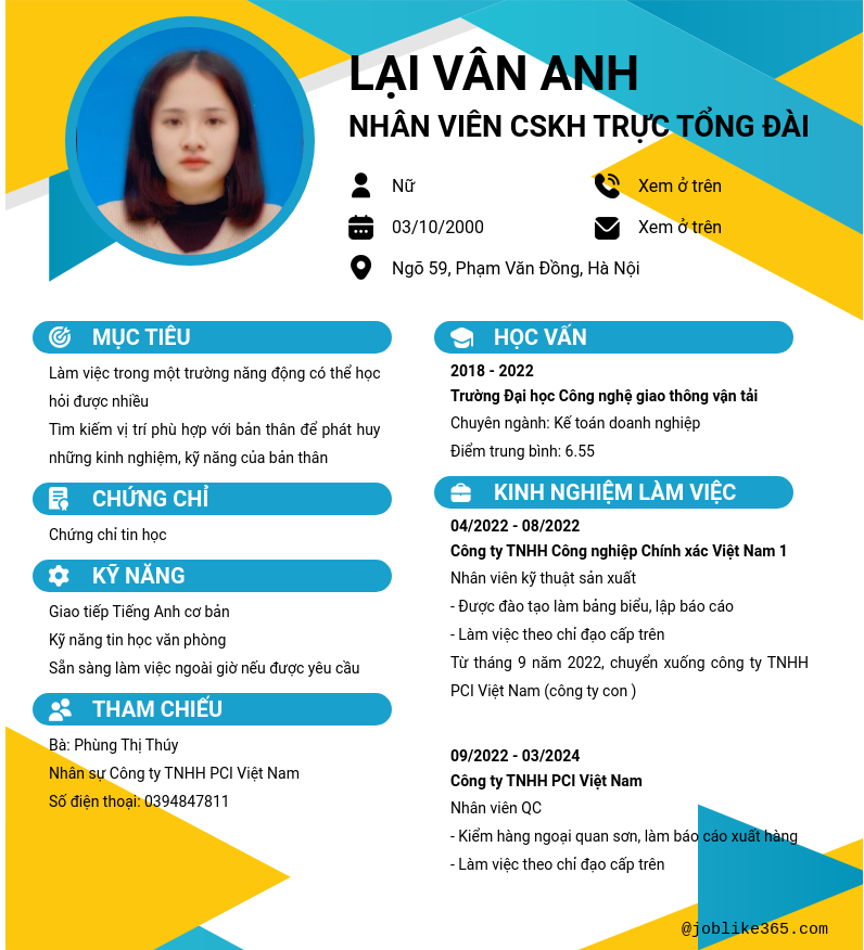 Xem hồ sơ ứng viên Lại Vân ANH cần 2 điểm. Hồ sơ được cập nhật ngày: 19/08/2024