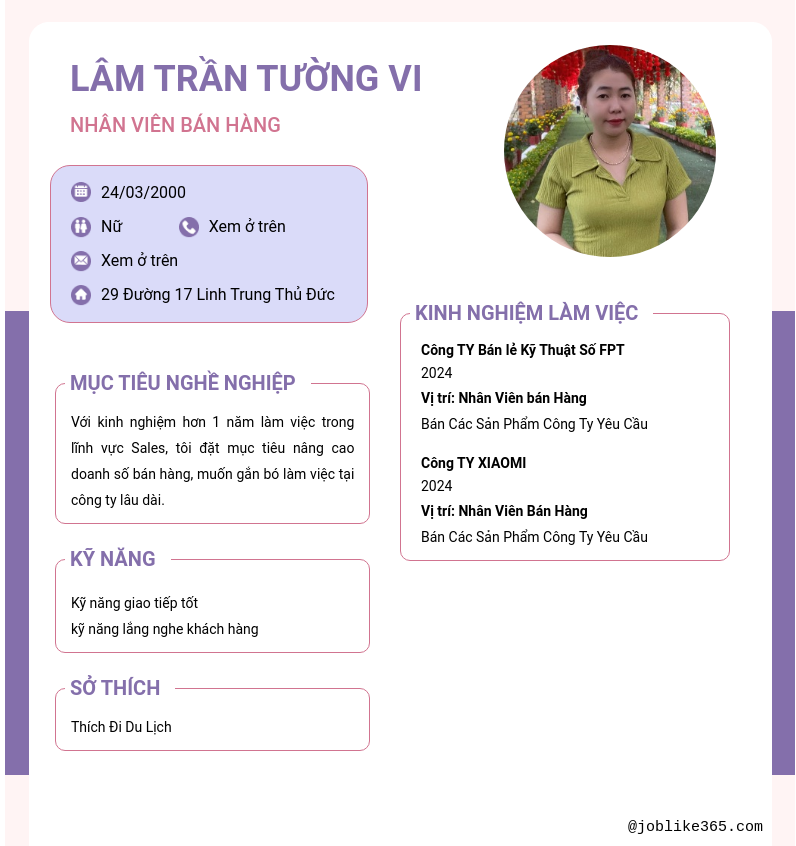 Xem hồ sơ ứng viên Lâm Trần Tường Vi cần 2 điểm. Hồ sơ được cập nhật ngày: 17/04/2025