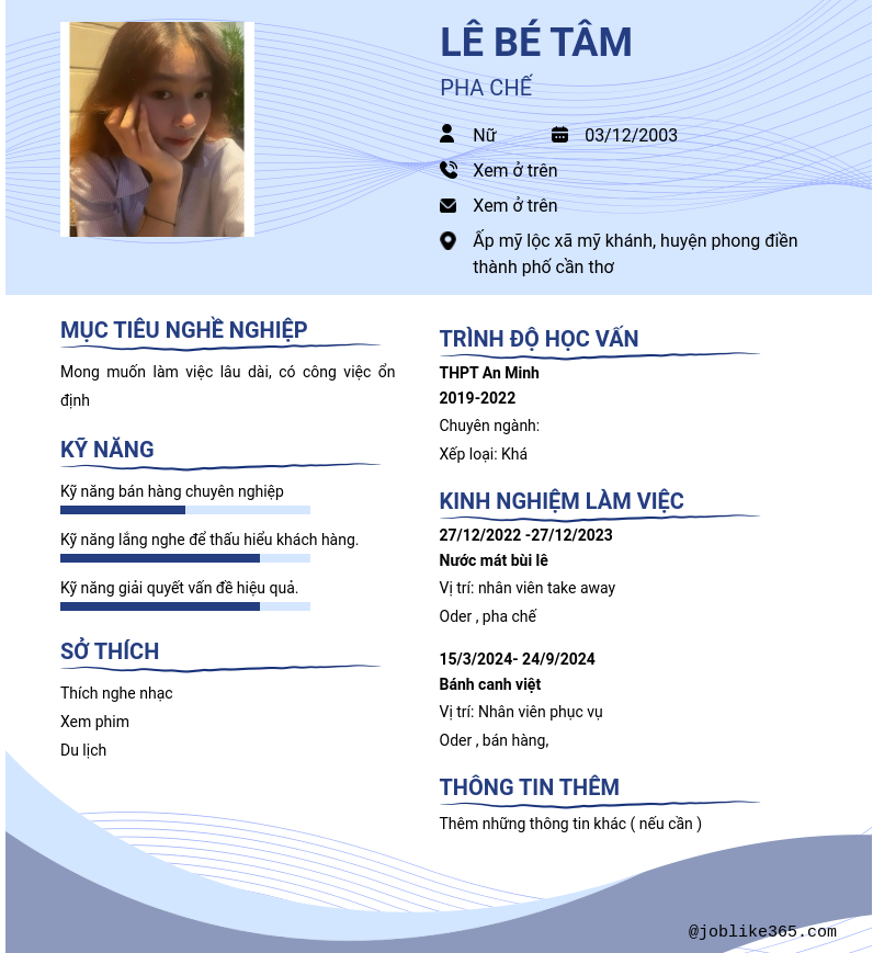 Xem hồ sơ ứng viên Lê bé tâm cần 2 điểm. Hồ sơ được cập nhật ngày: 11/10/2024
