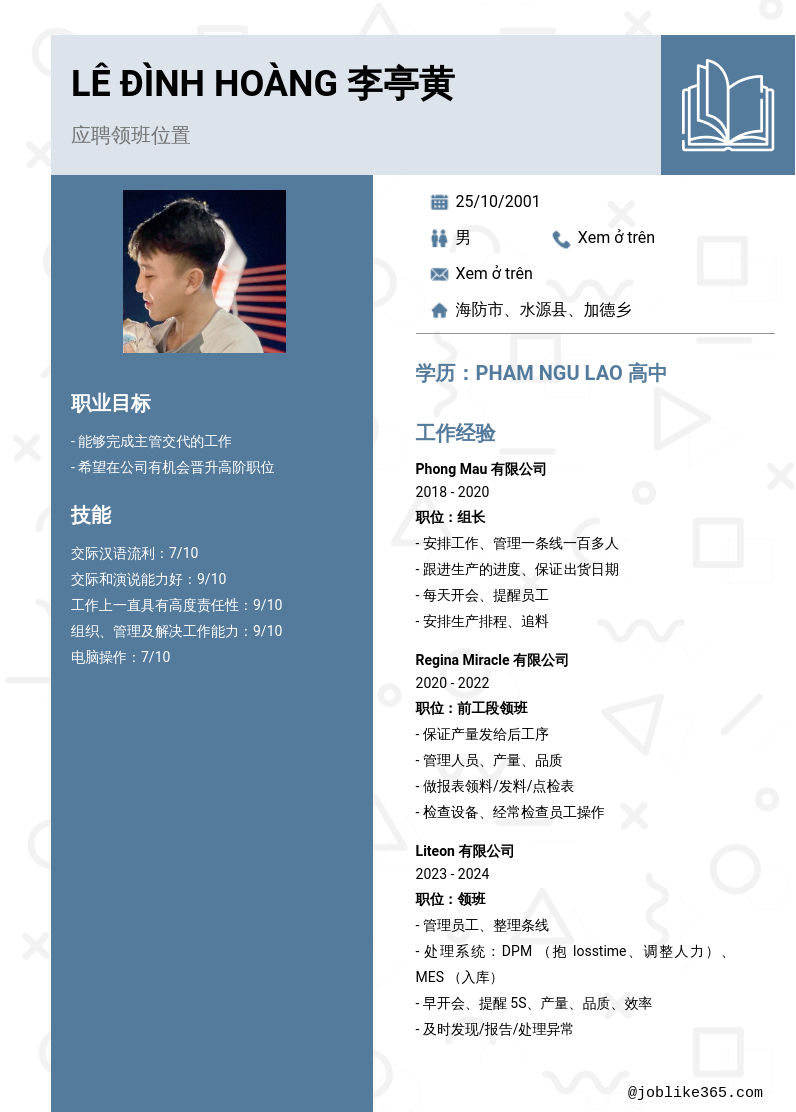 Xem hồ sơ ứng viên LÊ ĐÌNH HOÀNG 李亭黄 cần 2 điểm. Hồ sơ được cập nhật ngày: 02/08/2024