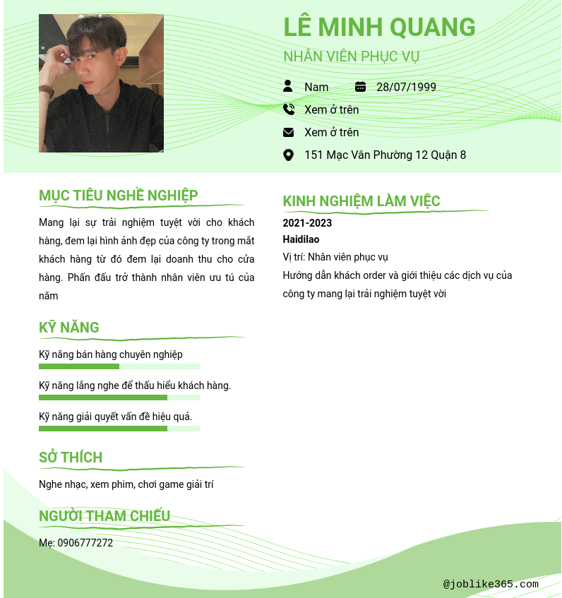 Xem hồ sơ ứng viên Lê Minh Quang cần 2 điểm. Hồ sơ được cập nhật ngày: 10/10/2024