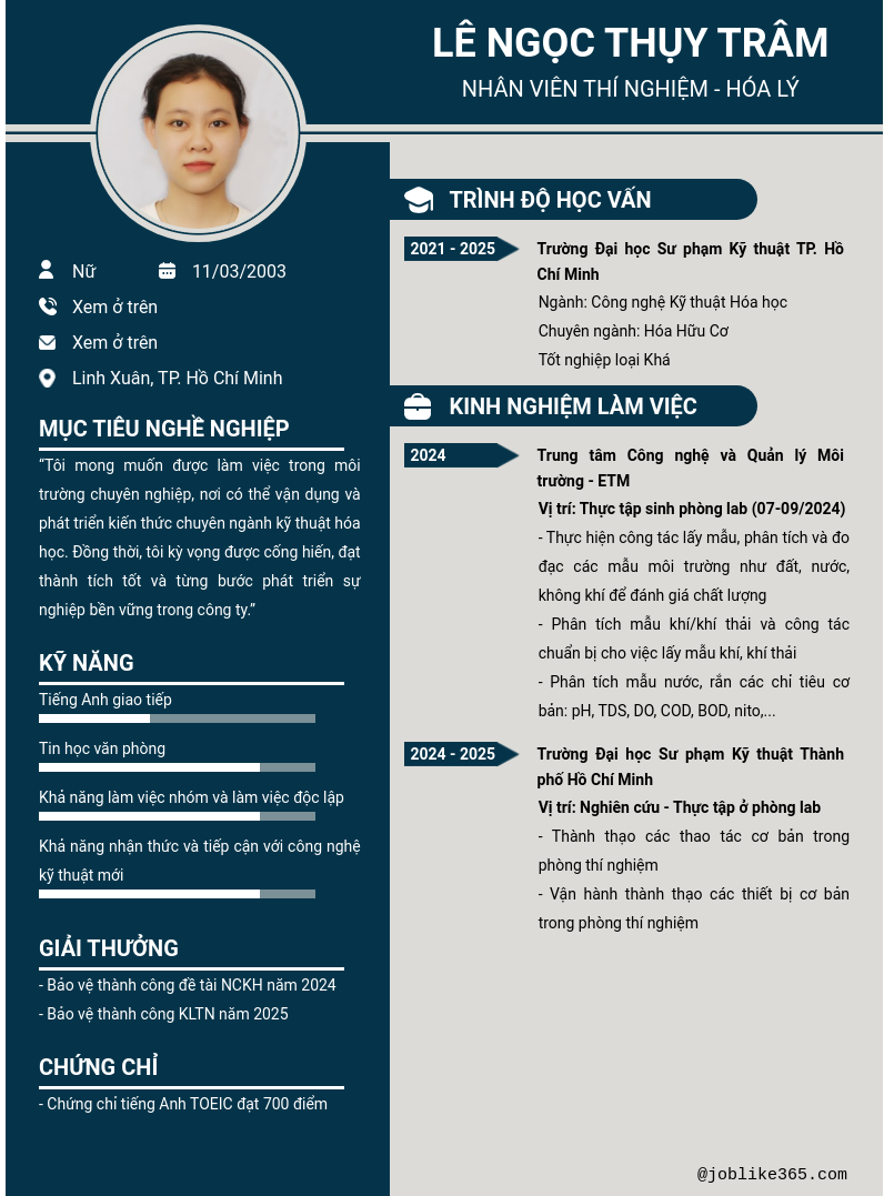 Xem hồ sơ ứng viên lê ngọc thụy trâm cần 2 điểm. Hồ sơ được cập nhật ngày: 25/10/2025