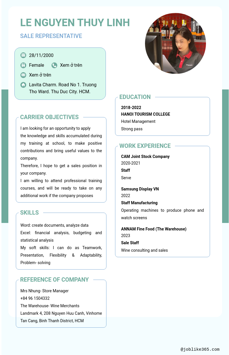 Xem hồ sơ ứng viên Le nguyen thuy linh cần 2 điểm. Hồ sơ được cập nhật ngày: 06/11/2024