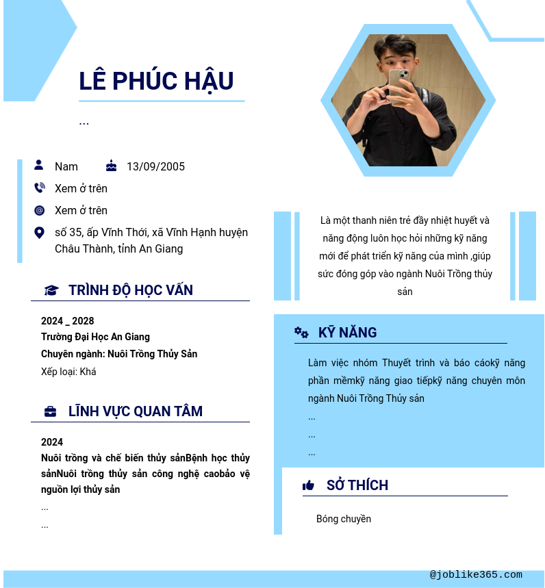 Xem hồ sơ ứng viên lê phúc hậu cần 2 điểm. Hồ sơ được cập nhật ngày: 24/12/2024