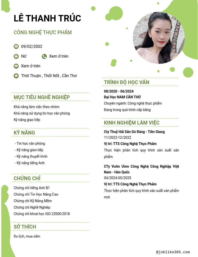 Xem hồ sơ ứng viên LÊ THANH TRÚC cần 2 điểm. Hồ sơ được cập nhật ngày: 08/10/2024