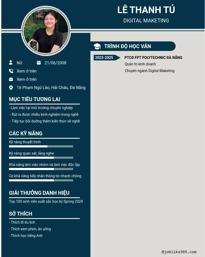 Xem hồ sơ ứng viên Lê thanh tú cần 2 điểm. Hồ sơ được cập nhật ngày: 16/09/2024