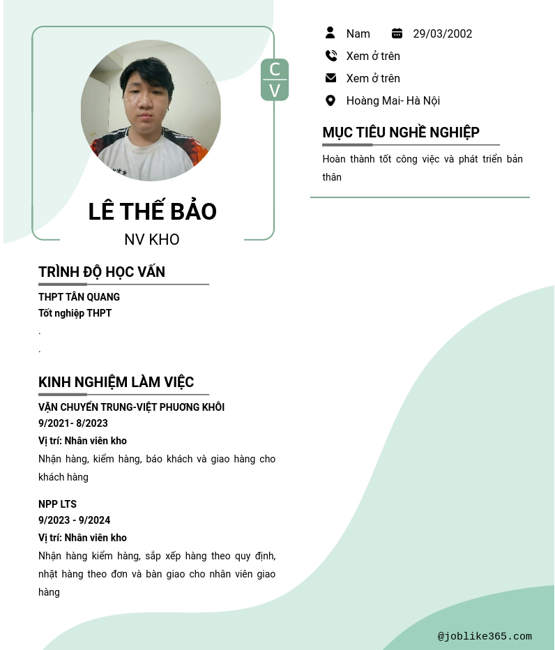 Xem hồ sơ ứng viên Lê thế bảo cần 2 điểm. Hồ sơ được cập nhật ngày: 14/10/2024