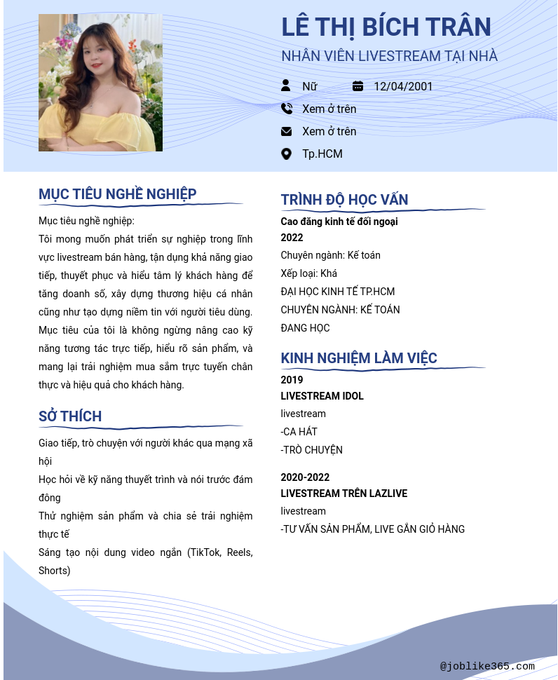 Xem hồ sơ ứng viên LÊ THỊ BÍCH TRÂN cần 2 điểm. Hồ sơ được cập nhật ngày: 03/09/2025